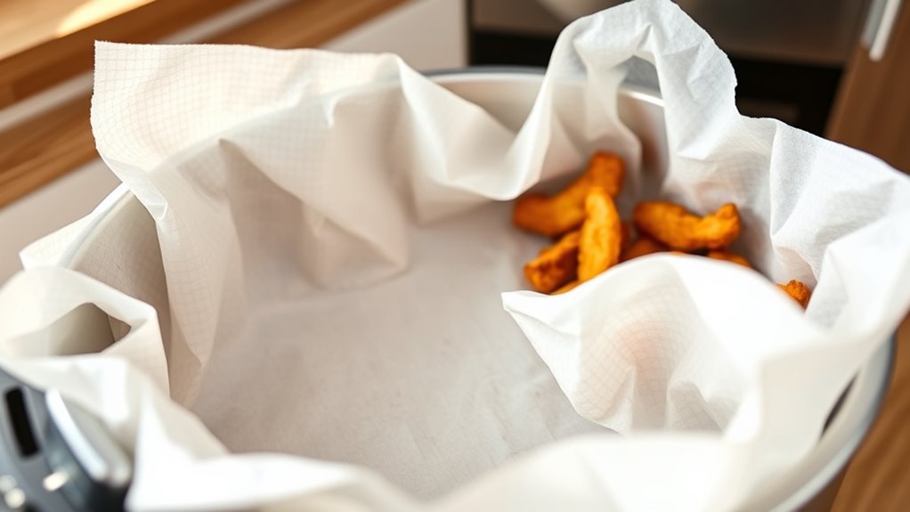 Using parchment paper won’t substantially affect cooking time or food texture if you place it correctly. It acts as a barrier on the cooking surface, allowing heat transfer to cook your food evenly. Just make sure the parchment paper is weighed down properly so it doesn’t block airflow or cause uneven cooking. When used properly, it helps keep your food crispy and prevents sticking, ensuring ideal results without altering cooking times.