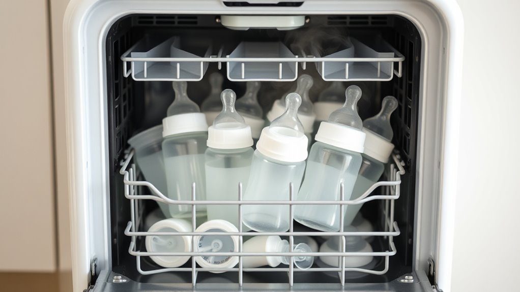 So, who knew that a tiny dishwasher could be your secret weapon against germs? It’s almost ironic—thinking your little one’s safety hinges on a small appliance you probably overlooked. Just a quick run, and those bottles are sparkling clean and sanitized, ready for the next feed. So next time you’re tempted to skip the extra step, remember: sometimes, the smallest tools make the biggest difference. After all, cleanliness is baby’s best friend.