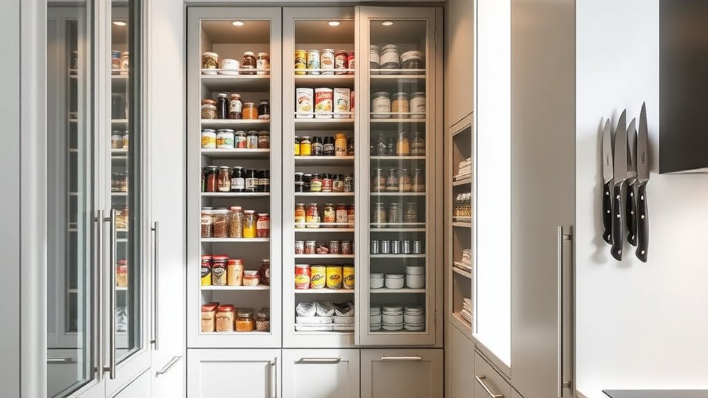 To prevent items from falling in tall storage units, you should use slide-out trays and anti-slip mats. Slide-out trays keep everything secure and easily accessible, reducing the risk of items toppling over. Anti-slip mats provide extra grip, especially on shelves or inside drawers. Together, these solutions guarantee your items stay put, making your kitchen safer and more organized while maximizing vertical storage space.