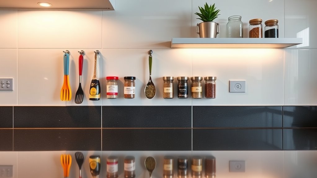 Modern materials like tempered glass or acrylic sheets can be cut to size at your local hardware store or home improvement center. When installing, use appropriate adhesives designed for the material to guarantee a strong bond. For added support, consider mounting brackets or rails that can hold pots, utensils, or spice jars. Magnetic strips are perfect for metal-backed panels, allowing you to keep knives or metal tools within easy reach. When attaching hooks or small shelves, avoid overloading them to prevent damage or detachment.