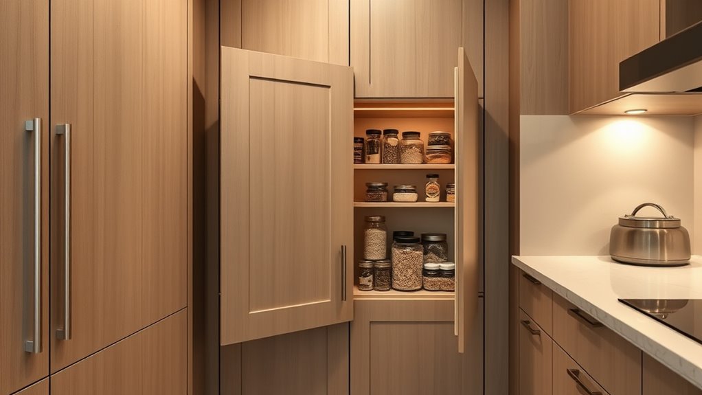 Ultimately, building a hidden pantry is about balancing concealment with accessibility. With the right disguise techniques, you can keep your supplies out of sight yet within easy reach. Space optimization ensures you make the most of every inch, transforming an overlooked corner into a valuable storage solution. Whether you choose a secret door, a disguised cabinet, or a hidden compartment, your efforts will pay off in a cleaner, more organized kitchen that looks as stylish as it is smart. This innovative approach lets you enjoy the benefits of extra storage without sacrificing the aesthetic appeal of your home.