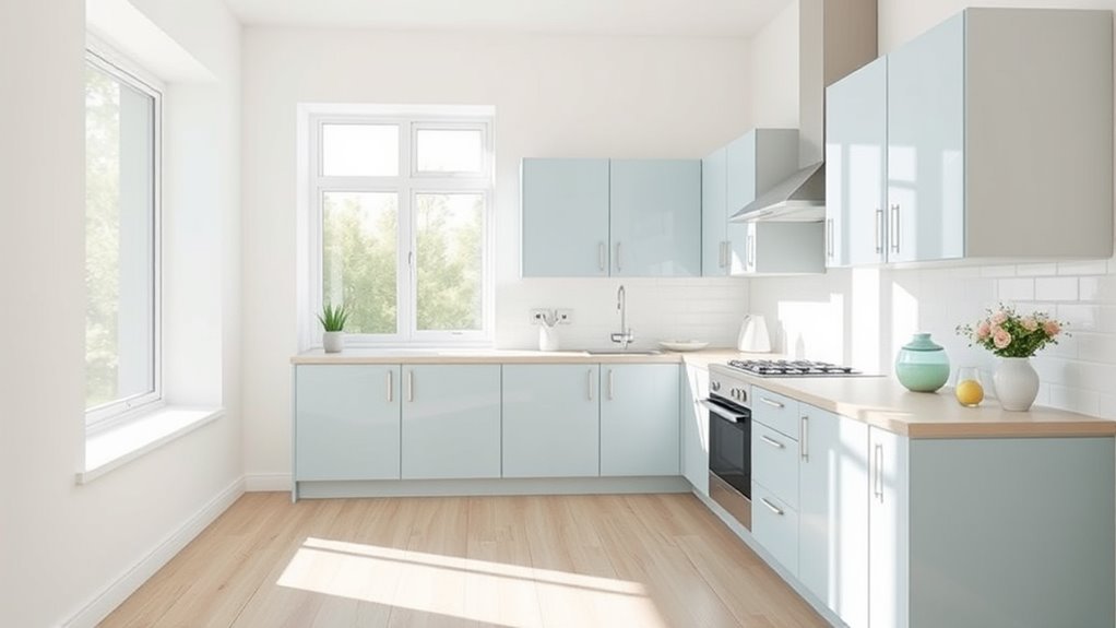 Natural light greatly influences your color choices in small kitchens by enhancing color brightness and creating an open, airy feel. If your space receives ample sunlight, opt for lighter, brighter shades to maximize the sense of space. Conversely, if light is limited, choose softer, muted tones that reflect available light without making the room feel cramped. Adjusting your colors based on natural light helps your kitchen appear more spacious and inviting.