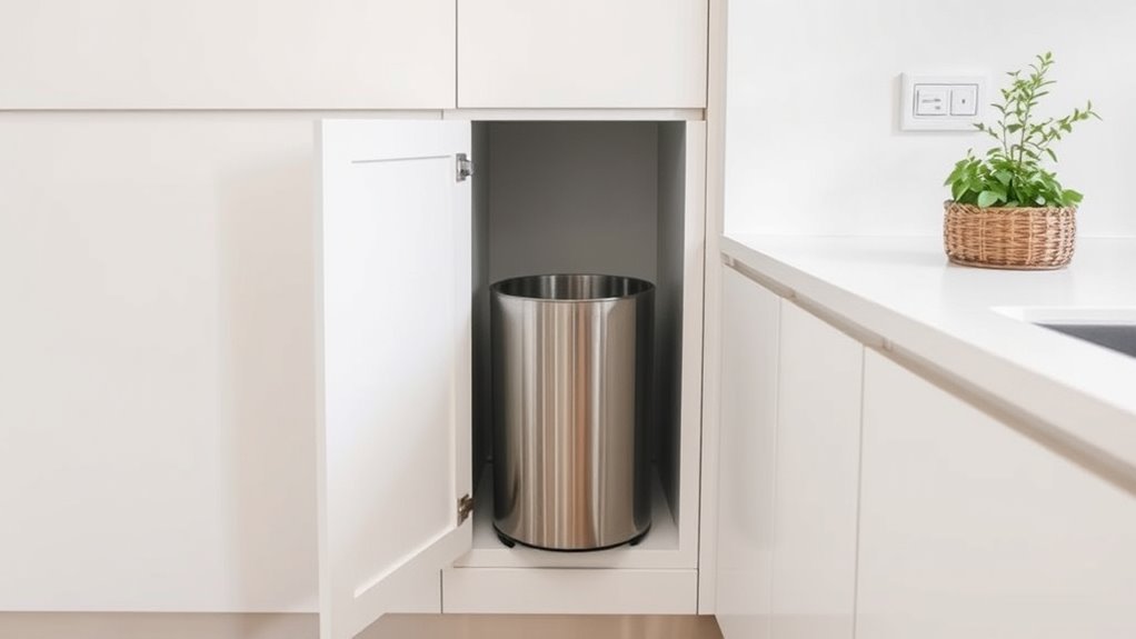 To make your trash can accessible yet hidden, consider installing a decorative cabinet with pull-out drawers. This way, you keep it within reach when needed, but it stays out of sight when not in use. You can even choose a cabinet style that matches your kitchen decor, blending functionality with aesthetics. Pull-out drawers make accessing your trash simple, while maintaining a clean, uncluttered look for your small kitchen space.