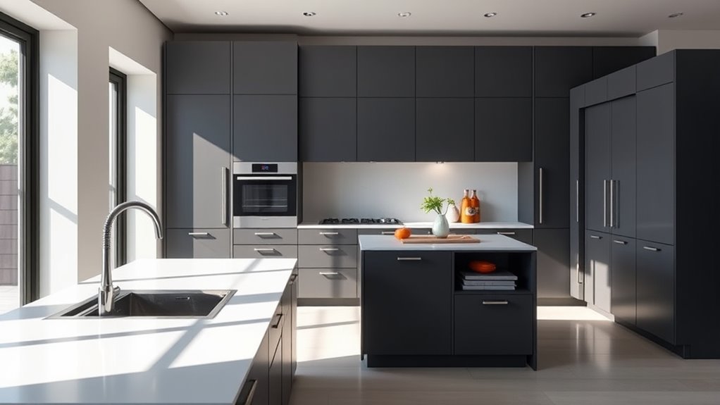 Modular units are designed to handle heavy or bulky appliances thanks to their high weight capacity and durability testing. You can confidently place your oven, fridge, or dishwasher on these sturdy modules, knowing they’re built for strength. Manufacturers conduct rigorous durability testing to ensure the units support substantial weight without sagging or breaking. This makes modular furniture a reliable choice for accommodating your kitchen’s heavy appliances safely and efficiently.