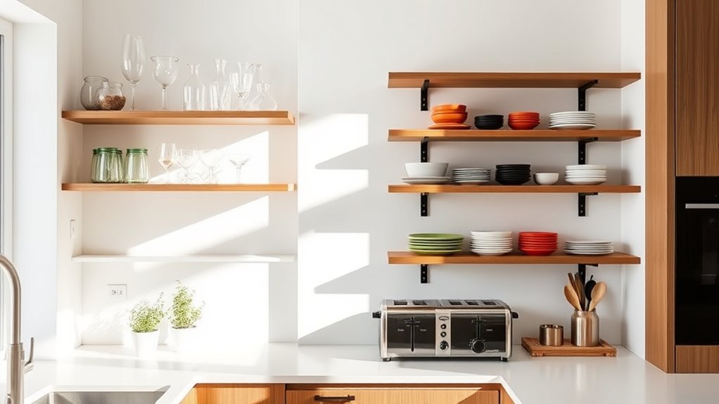 Open shelves brighten your kitchen by reflecting natural light and creating an inviting ambiance. They enhance the overall lighting with an ambient glow, making the space feel larger and more open. With carefully arranged items, you can maximize natural brightness while avoiding clutter. Open shelving invites visual flow, draws attention to your decorative pieces, and fosters a warm, welcoming atmosphere, transforming your kitchen into a lively, well-lit hub for cooking and gathering.