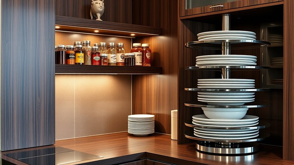 By optimizing your corner shelves and lazy Susans, you transform cluttered, wasted corners into efficient, accessible spaces. Picture a chaotic pantry suddenly organized, where items glide smoothly on rotating shelves, like a well-oiled machine. Instead of feeling overwhelmed by tight corners, you enjoy the sense of harmony and ease they bring. With a few simple adjustments, your kitchen becomes a sleek, functional sanctuary—proof that smart organization turns every corner into a masterpiece.