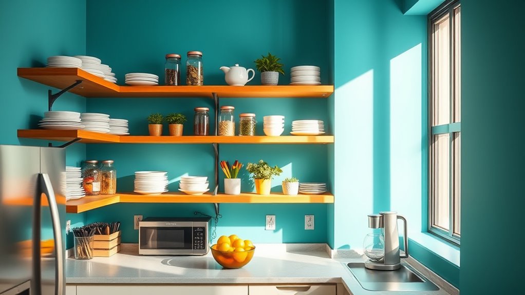 By strategically using open shelving, you can maximize your tiny kitchen’s functionality and style. Remember, studies show that 70% of small kitchen owners find open shelves make their space feel larger and more inviting. So, don’t be afraid to showcase your favorite dishes and accessories. With thoughtful placement, open shelving not only adds storage but also creates a welcoming, airy atmosphere—making your tiny kitchen feel surprisingly spacious and personalized.