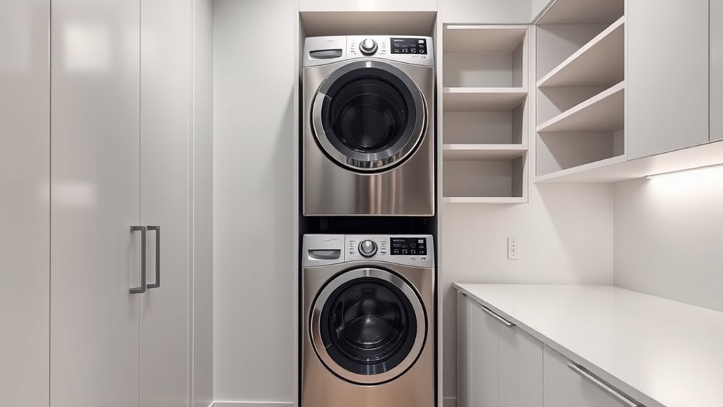 To implement effective space saving techniques, start by evaluating your available height and choosing storage options that make the most of it. Adjustable shelving units or stacking kits are excellent tools to help you secure appliances safely in a vertical arrangement. For example, stacking your washer and dryer with a sturdy, purpose-built stacking kit can save a significant amount of space. Additionally, wall-mounted racks or shelves can hold smaller appliances or accessories, keeping them within reach but off the floor. When you elevate bulky items, you create a cleaner, more organized environment and reduce the risk of accidents caused by cluttered floors.