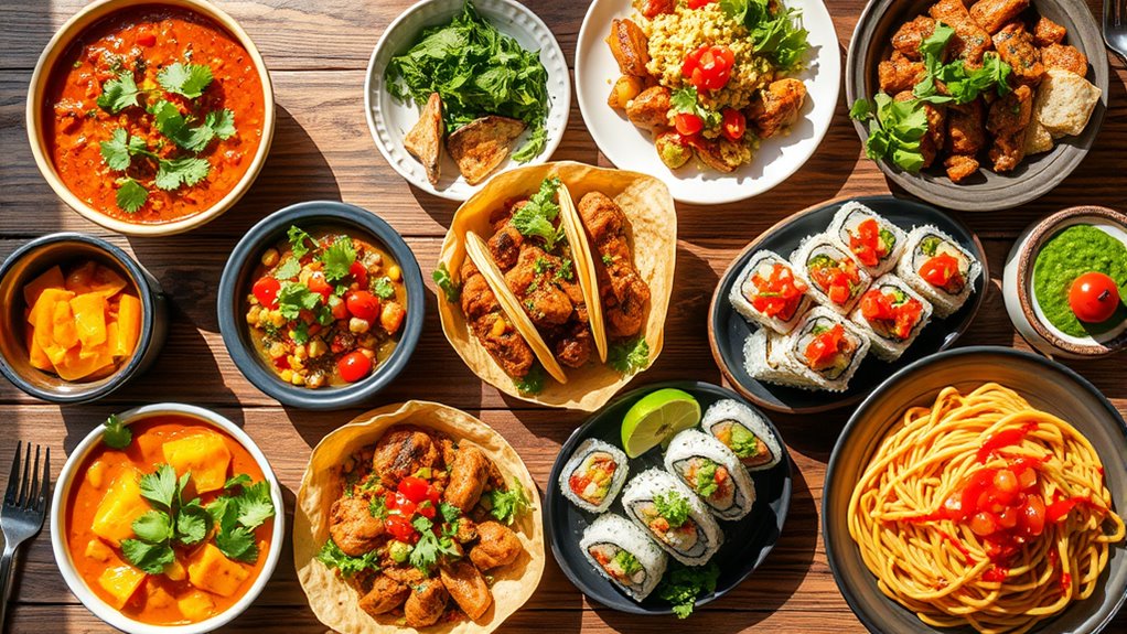 Incorporating international cuisines into your meal planning adds excitement, authentic flavors, and cultural techniques to your dishes. Using spice blends like garam masala or za’atar can quickly transform simple ingredients into global favorites. Experimenting with different cooking methods, such as slow simmering or stir-frying, helps recreate authentic tastes. By exploring these flavors and techniques, you can turn everyday meals into delicious international adventures—continue exploring to discover how to master these vibrant cuisines.