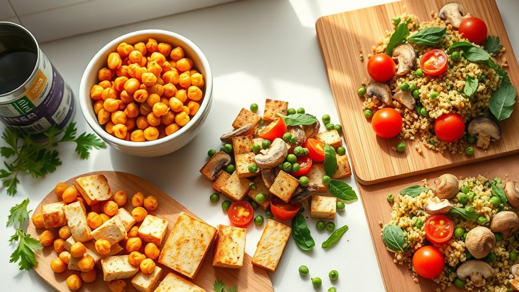Switching to plant-based proteins for weeknights helps you create quick, nutritious meals that are full of flavor. Try pre-seasoned veggie burgers, sliced veggie sausages, or tofu and tempeh—they cook fast and absorb flavors well. Use grains like quinoa or brown rice, cooked in advance, to add texture and energy. Combining these ingredients with your favorite sauces keeps meals simple yet satisfying. Keep exploring for more ideas to make nourishing plant-based dinners even easier.