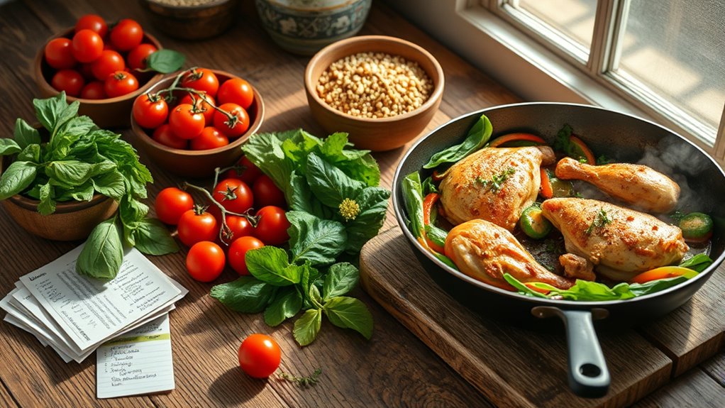 You can incorporate seasonal ingredients into your meal plan by doing some seasonal shopping at local markets, which often offers better prices and freshness. Focus on ingredient versatility, choosing items like squash, greens, or root vegetables that can be used in various dishes. Plan meals around what’s in season, experimenting with different cooking methods to maximize flavor and variety without overspending. This approach keeps your meals fresh, tasty, and budget-friendly.