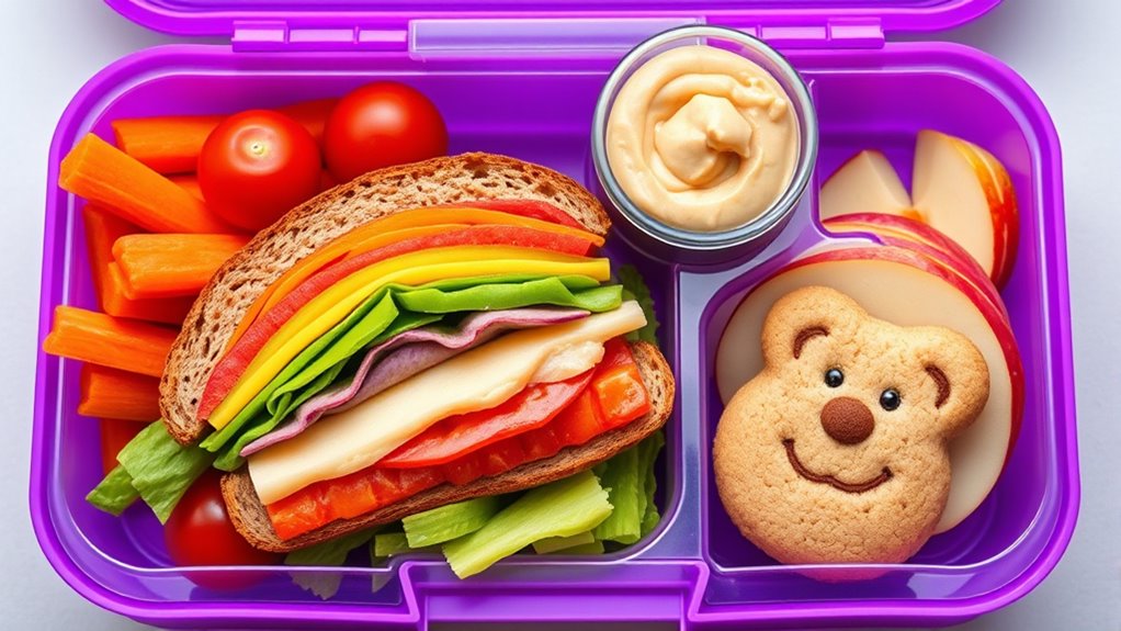 Start by selecting items that are colorful and appealing, encouraging kids to eat without fuss. For example, cut fruits into fun shapes or serve crunchy vegetables with a tasty dip. Keep portion sizes suitable for your child’s age—smaller portions for younger kids and slightly larger ones for older children. This prevents overeating and helps them learn about listening to their hunger cues. Remember, a balanced lunch isn’t just about quantity; it’s about quality. Incorporate whole-grain bread or crackers instead of refined options, and choose lean meats, beans, or eggs for protein. Dairy can be included through milk, cheese, or yogurt, which also adds calcium and vitamin D.