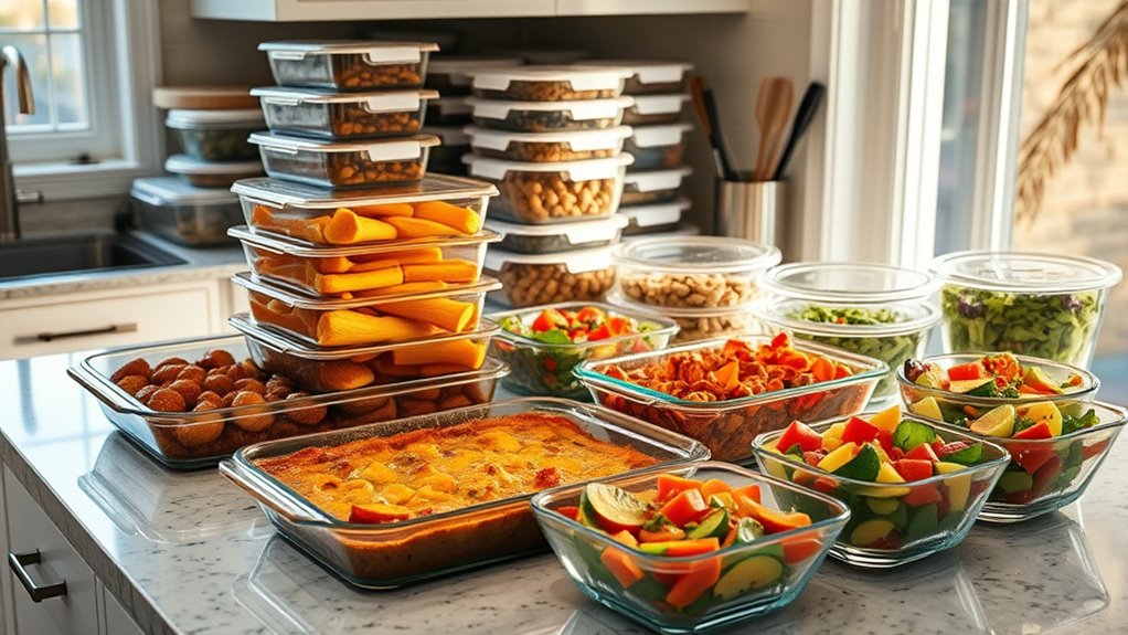 You can prep holiday meals safely up to 3-4 days in advance by following proper food safety and meal storage guidelines. Store cooked dishes in airtight containers and keep them refrigerated at 40°F or below. For longer storage, freeze meals to prevent spoilage. Always reheat leftovers thoroughly before serving. By planning ahead and practicing good meal storage, you guarantee your holiday meals stay fresh and safe for everyone to enjoy.