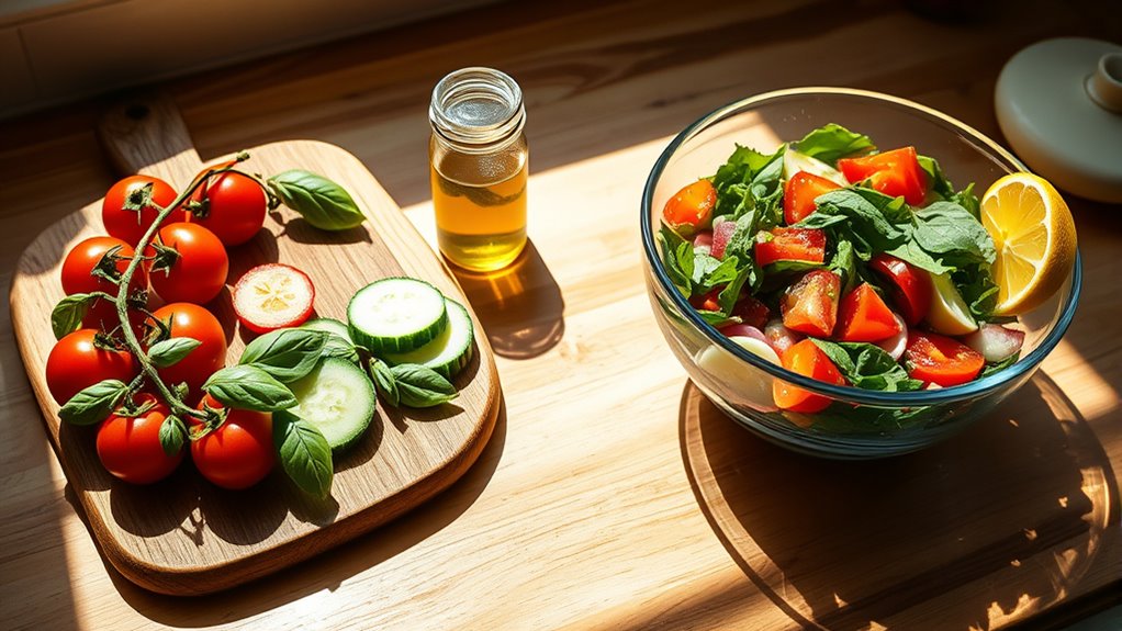 Have you ever wondered why seasonal recipes taste so much better? It’s because they’re crafted with ingredients that are at their peak freshness, which amplifies flavor and makes every bite more satisfying. During summer, this means taking advantage of ripe garden herbs and juicy fruit salads to create vibrant, flavorful meals even in small kitchens. With a little planning, you can turn limited space into a culinary playground, making the most of what’s in season. Starting with garden herbs, these fresh additions pack a punch of aroma and taste that instantly elevate simple dishes. Basil, mint, cilantro, and parsley thrive in warm weather and can be grown easily in small pots or window boxes. Incorporate these herbs into your salads, dressings, or even grilled vegetables for a burst of invigorating flavor. Their fragrant oils are at their strongest during summer, so don’t be shy—pound them into pestos or sprinkle them over your dishes to capture that garden-fresh flavor. Additionally, tuning techniques can be employed to optimize the flavor extraction from fresh herbs and ingredients. Fruit salads are the perfect summer snack or side dish, especially in small kitchens where space for elaborate preparations might be limited. The beauty of fruit salads is that they’re quick to assemble, require minimal equipment, and can be customized with seasonal fruits that you can find at local markets or your own backyard. Think juicy watermelons, sweet peaches, tart cherries, and ripe berries—each adding their unique flavor and color. Toss them together with a touch of honey, fresh mint, and a squeeze of lemon or lime for a revitalizing treat that cools you down and satisfies your sweet tooth. These salads are not only easy to prepare but also versatile; you can serve them as a light dessert, a brunch item, or a side for grilled meats. Plus, they don’t take up much space in your fridge or pantry, making them ideal for small kitchens.