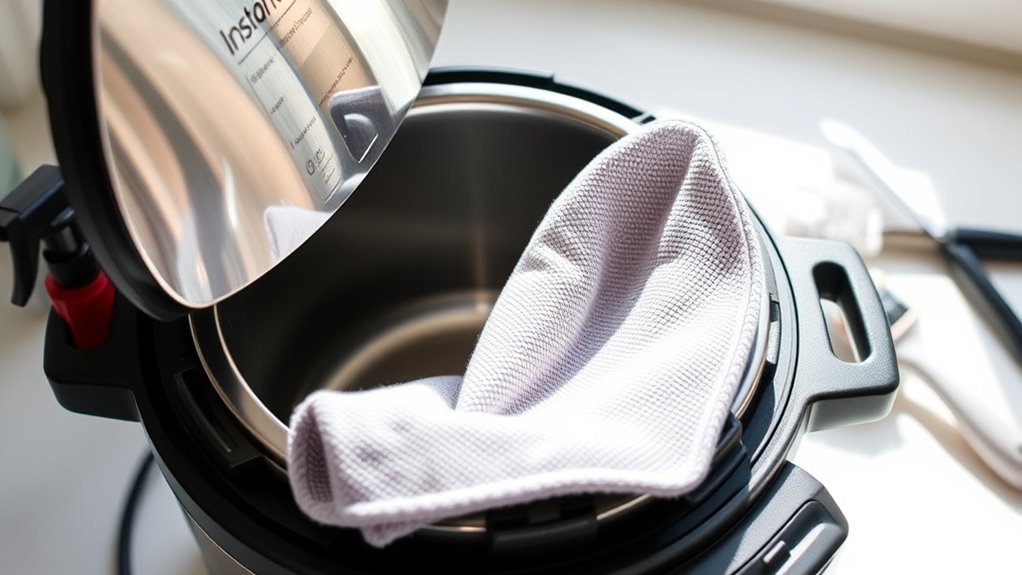 Maintaining your Instant Pot isn’t just about cleaning; it’s about keeping all parts in good shape. Periodically check the sealing ring, gasket, and other removable parts for damage. If anything looks worn out or damaged, replacing it promptly will help prevent issues during cooking. Also, wipe down the exterior with a damp cloth to keep it looking new. Avoid using abrasive cleaners or scouring pads, which can scratch the surface. By paying attention to these details, you’ll guarantee your Instant Pot performs at its best every time you use it. Regular maintenance and proper cleaning routines will extend its lifespan and keep your cooking safe and efficient.