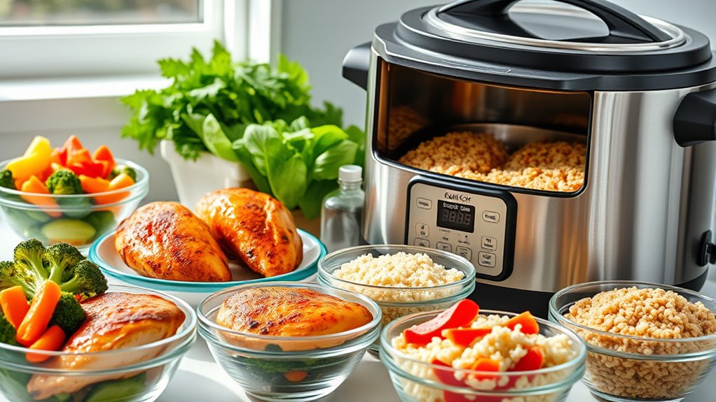 Using a multicooker for meal prep helps you streamline your nutrition routine by cooking large batches of protein-rich meals like chicken stews, lentil soups, and egg casseroles. It saves time, reduces stress, and guarantees you always have nutritious options ready to support your energy, recovery, and muscle growth goals. Plus, it makes sticking to your hydration and protein timing easier. Keep exploring to discover even more ways to maximize your fitness nutrition with a multicooker.