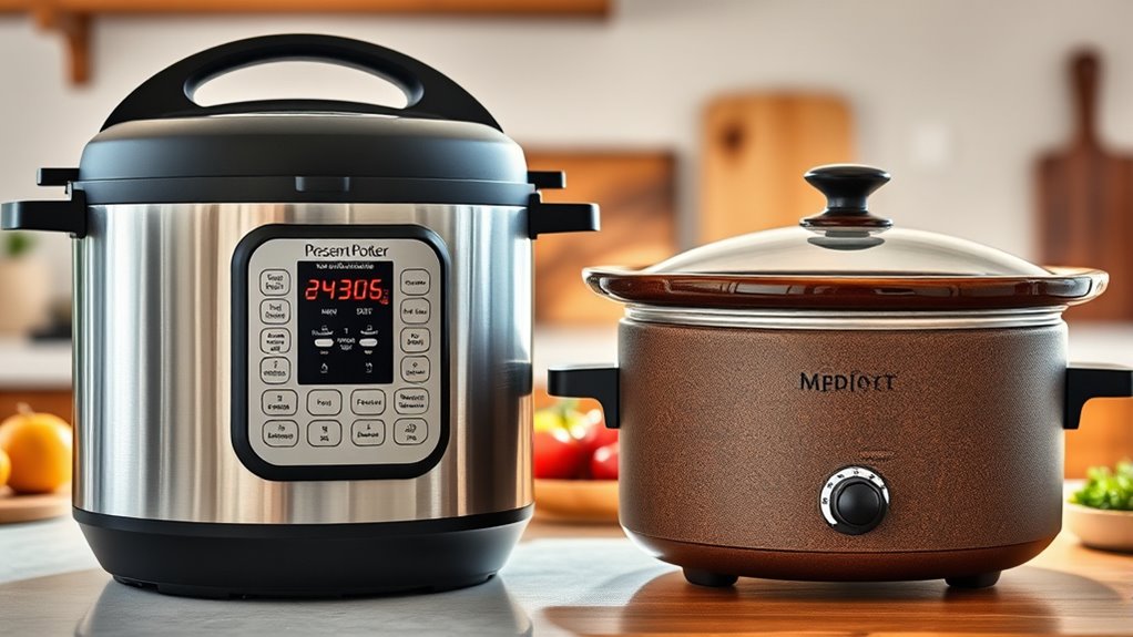 A multicooker offers multiple functions like sauté, steam, bake, and pressure cooking, providing versatility in one device. In contrast, a slow cooker is simple, designed mainly for long, unattended simmering to develop rich flavors with minimal effort. If you value quick, varied cooking options, a multicooker is a great choice. But if you prefer easy, low-energy, hands-off meals, a slow cooker might suit you better. Keep exploring to discover which appliance fits your cooking style best.