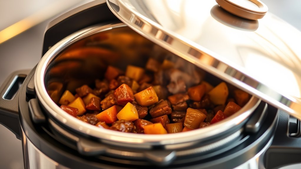 Think of your Instant Pot as a modern-day knight’s shield—protecting your food from sticking. To prevent sticking during searing, use a good non-stick coating or seasoning techniques like preheating the pot and adding enough oil. Keep the food dry before adding, and avoid overcrowding. Stir gently and give it time to develop a crust before turning. These steps will help keep your ingredients from sticking and ensure perfect searing.