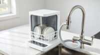 Maintaining a multicooker is straightforward when you choose a model with dishwasher-safe parts, like the inner pot and accessories, which makes cleanup much easier. Non-stick or ceramic-coated surfaces also help because they prevent food from sticking and make wiping down a breeze. A removable lid that can be cleaned easily—and ideally is dishwasher safe—saves time and effort. Safety features like automatic shut-off and cool-touch exteriors add peace of mind during cleaning. Regularly cleaning the sealing ring, steam vent, and exterior surfaces is essential to prevent odors and residue buildup, ensuring ideal performance. By selecting a model with these features, you’ll find maintenance simple and quick, keeping your multicooker in top shape for years to come.