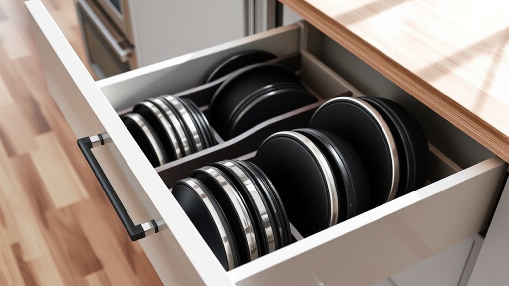 Adjustable features are essential because they determine how well a pot lid organizer can adapt to your unique cookware collection. Repositionable dividers or arms let you customize the space for lids of various sizes, typically ranging from 6 to 24 inches in diameter. This flexibility allows you to accommodate different shapes, whether round, square, or rectangular, by adjusting the spacing between compartments. Many models use tool-free mechanisms like sliding, snapping, or screw-tightening for quick adjustments, making reconfiguration effortless. The ability to expand or contract the length and width ensures a perfect fit within your cabinet or drawer, maximizing space. Overall, adjustable features enhance versatility, so your storage adapts seamlessly to your cookware and space constraints.