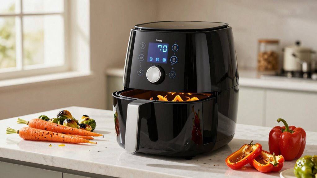 Safety features are like gentle guardians, ensuring peace of mind. These air fryer ovens include automatic shut-off to prevent overheating, cool-touch exteriors for safe handling, and secure door latches for stability. Many also have overheat protection and non-slip feet. I feel reassured knowing these thoughtful protections are in place, letting me focus on cooking delicious vegetables without worry. Safety is truly an essential ingredient in every kitchen appliance.