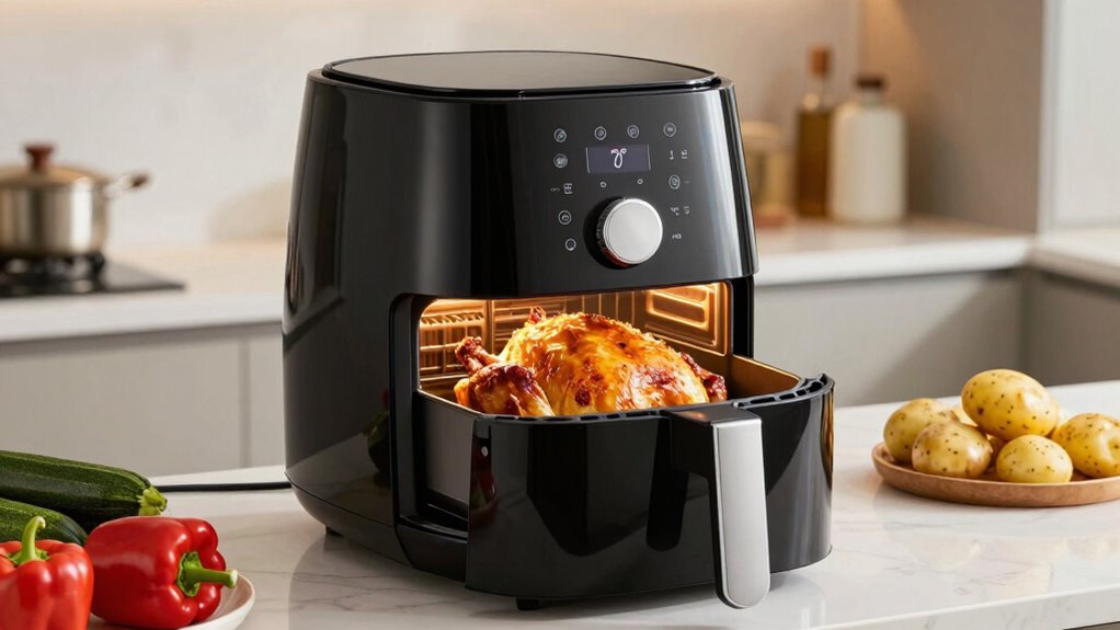 Are you selecting an air fryer with enough space to handle a whole chicken? If so, look for models with at least 12 quarts of capacity. This size comfortably fits a whole chicken and promotes even cooking. Larger models, like 26 to 32 quarts, are great if you want to prepare family-sized meals or multiple dishes at once. It’s important to evaluate the internal dimensions and whether the size suits your typical meal portions and available kitchen space. Smaller capacities may limit your ability to roast large cuts or a whole bird, reducing versatility. Also, make sure the overall size of the unit fits comfortably on your countertop or storage area. Choosing the right capacity guarantees convenience and ideal cooking results.