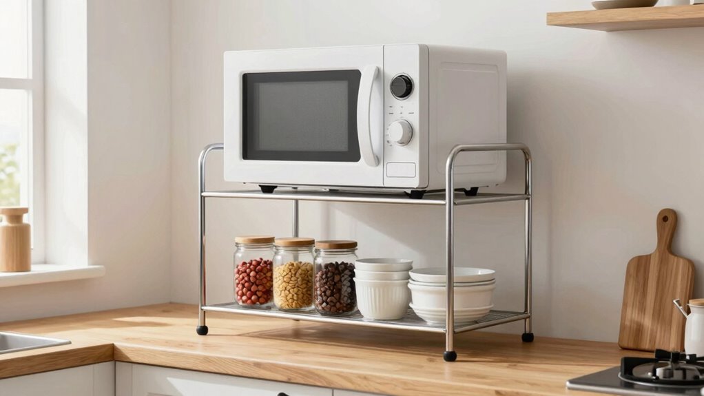 Think of these racks as a tailor-made suit for your kitchen needs. Yes, most of them can be customized or adjusted to fit different microwave sizes. I’ve found that many come with adjustable shelves or modular components, making it easy to adapt them to your specific appliances. This flexibility guarantees your microwave and other essentials sit comfortably, transforming your space into a well-fitted, efficient kitchen sanctuary.