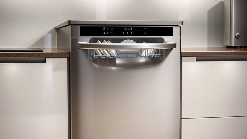Programmable features are essential for customizing your dishwashing experience to suit your needs. They let you adjust wash cycles, temperatures, and drying options for ideal cleaning. Many built-in dishwashers include delay start timers, so you can set cycles to run during off-peak hours, saving time and energy. Advanced models offer sanitation modes that heat water to high temperatures, like 162°F or 167°F, ensuring thorough sterilization of your dishes. Some also feature programmable drying functions, such as auto-open doors or hot air drying, which help remove moisture and cut down on manual drying. Being able to save preferred settings improves efficiency and consistency, especially if you have specific cleaning needs or frequently use certain cycles. These features make your dishwasher more versatile and user-friendly.