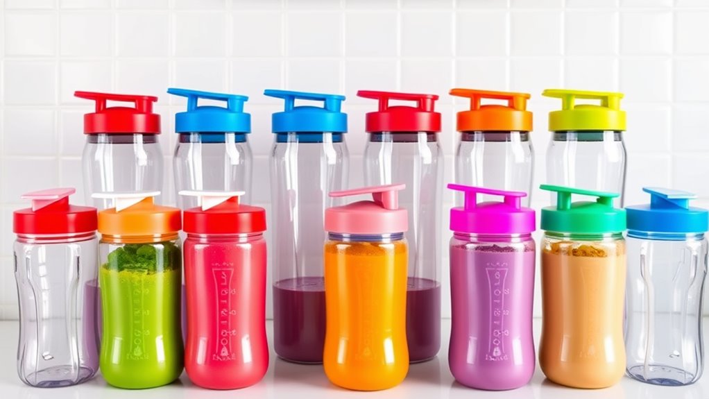 Choosing a safe smoothie blender bottle means carefully checking the materials it’s made from. I look for bottles made from BPA-free, food-grade plastics like Tritan or polypropylene to avoid harmful chemical leaching. It’s also essential that all plastic parts, including lids and seals, are free from toxins like BPS, PVC, and phthalates, ensuring safe daily use. I prefer bottles with stainless steel or glass containers because they’re non-toxic, durable, and don’t retain odors or stains. Additionally, I check for certifications such as FDA approval or NSF certification, which indicate the materials meet safety standards. Durability matters too—materials should resist cracks and degradation over time to keep the bottle safe during regular use.