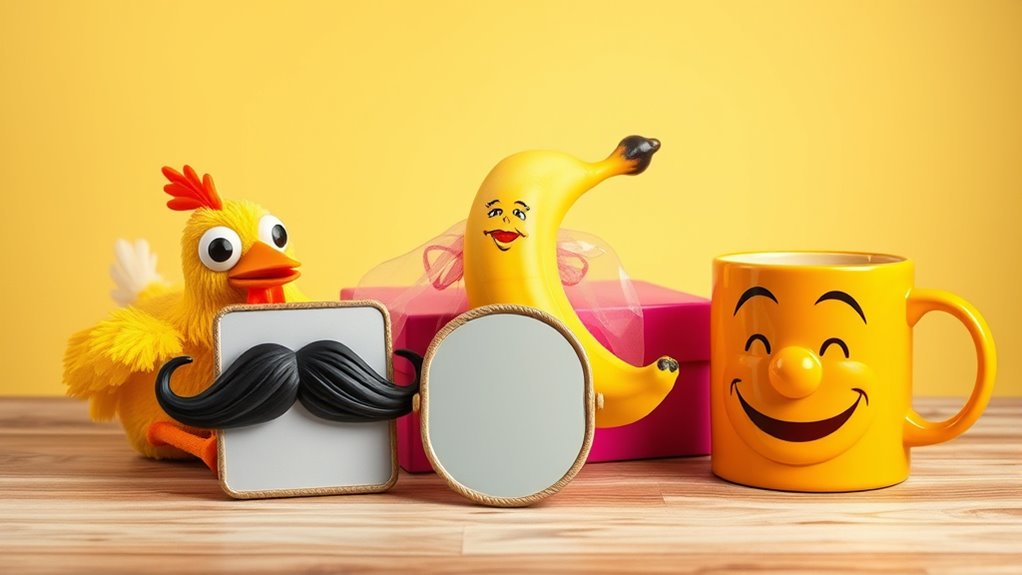 Looking for budget-friendly funny gifts? I’ve got you covered! Imagine slipping a “World’s Okayest Employee” mug or a hilarious fake lottery ticket into a card — instant laughs without breaking the bank. You can also find silly socks, quirky fridge magnets, or goofy stress balls for under ten bucks. These little gems pack big humor and make perfect, affordable surprises that’ll have everyone smiling without draining your wallet.