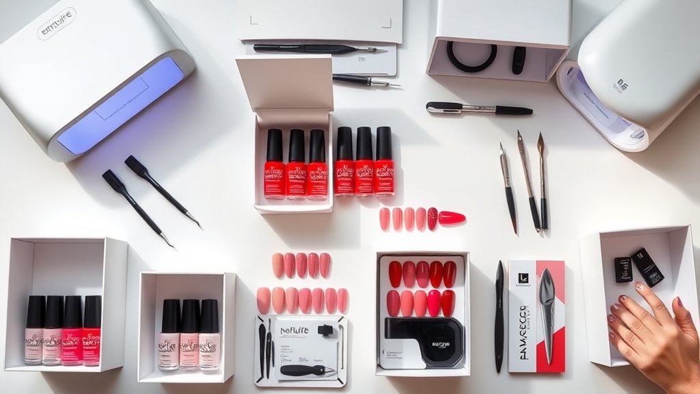 Choosing a gel nail kit that’s easy to use is essential for beginners, as it helps guarantee a smooth and stress-free experience. Look for kits with clear, step-by-step instructions and visual guides to simplify the application process. Kits featuring pre-measured gel bottles and minimal curing steps make the process faster and less confusing. An easy-to-use UV or LED lamp with automatic sensing can also streamline your manicure. Additionally, selecting kits with thorough tutorials or customer support ensures you have help when needed. Simplified designs or all-in-one components can further reduce complexity, making the entire process more accessible. Overall, selecting a user-friendly kit helps you achieve professional-looking nails with less frustration and more confidence.