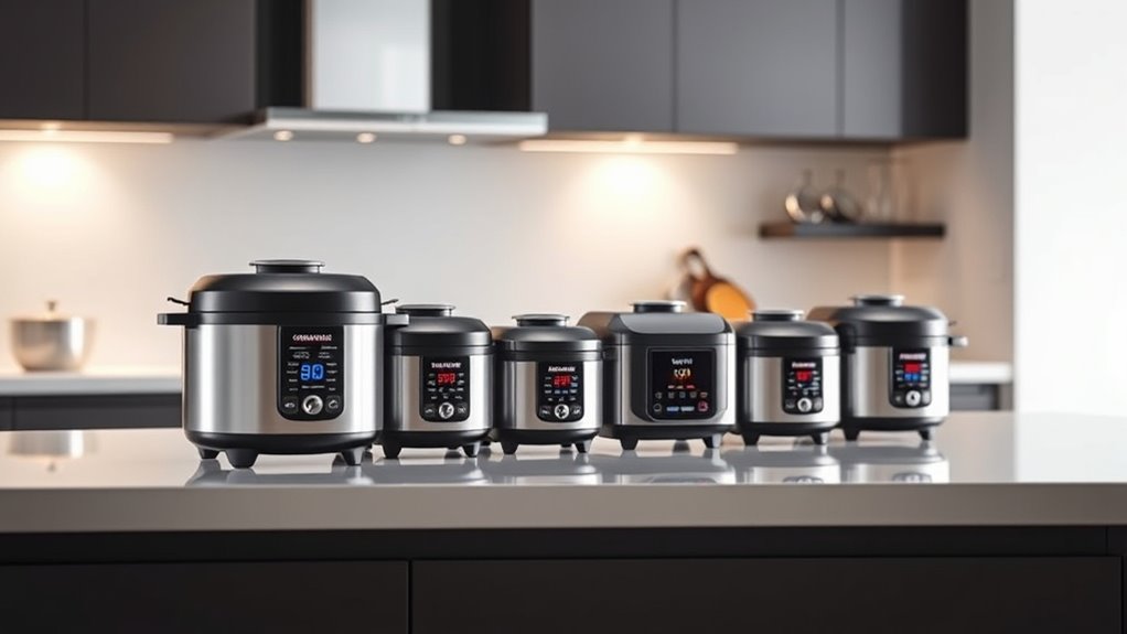 Thinking of a multicooker is like preparing for a journey—safety is your trusty map. I look for features like automatic shut-off, overheat protection, and child locks. These safeguards guarantee I avoid mishaps, much like a seasoned sailor avoiding storms. When choosing one, I double-check these safety features to cook confidently, knowing that my kitchen is secure and my meals are in good hands.