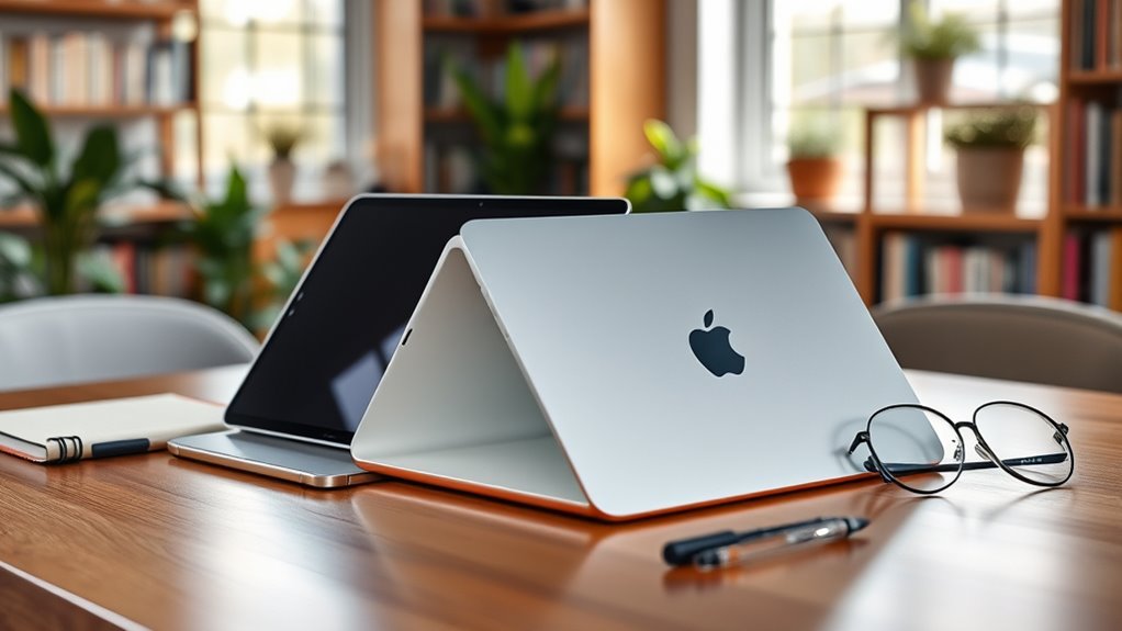 If you’re trying to decide between the iPad Pro 2025 and the iPad Air for school, I recommend considering your needs for performance and portability. The Pro offers a larger display and power suited for creative work or intensive multitasking, but it comes at a higher price. The Air provides solid performance, portability, and affordability, making it perfect for everyday tasks and study. Keep exploring for more details to help you choose the best one for your needs.