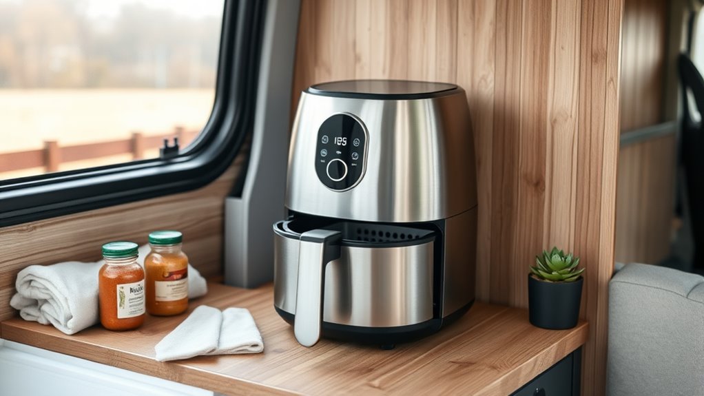 Since space is limited in van life, selecting a low-wattage air fryer that’s compact and lightweight can make all the difference, allowing me to maximize my small kitchen area without adding unnecessary bulk. These models typically operate between 800 to 1000 watts, making them energy-efficient and suitable for limited electrical systems. Their small sizes, usually 2 to 3-quart capacities, fit comfortably in tight spaces and make storage simple. A lighter weight means easier transport and less strain when moving or installing the unit. Plus, their limited basket size is perfect for single servings or small meals, aligning with the needs of van living. Overall, choosing a compact, portable air fryer ensures I can cook efficiently without sacrificing valuable space or mobility.