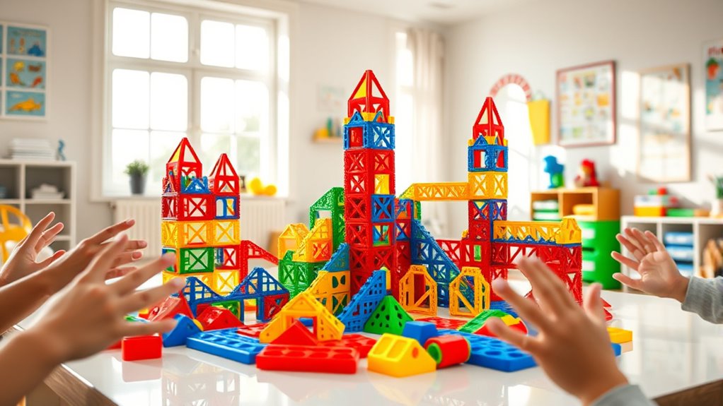Have you ever wondered how some magnetic tiles let kids build complex, dynamic structures while others feel limiting? The key lies in building flexibility options. Tiles with versatile shapes like squares, triangles, and arches open up more creative possibilities, allowing for intricate designs. Sets that include a variety of connector pieces and accessories enable expansion and customization, making building more engaging. The strength and placement of magnets are also vital—they determine how easily tiles connect in multiple orientations, impacting overall flexibility. Compatibility with different sizes and shapes allows seamless integration of various sets, broadening creative horizons. Additionally, modular or extendable features help children adapt and grow their constructions over time. These factors together create a versatile building experience, encouraging endless imaginative play.