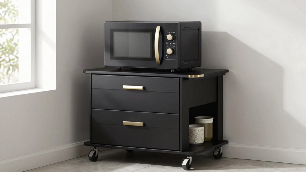 Mobility features are essential when selecting a microwave cart with drawers because they directly impact how easily you can move and position the unit in your kitchen. Lockable wheels are particularly valuable, allowing you to relocate the cart effortlessly while ensuring it stays securely in place during use. Swivel or omnidirectional wheels make movement smoother across different floor types, reducing effort and strain. These wheels also add flexibility, letting you adapt your kitchen layout for cooking, cleaning, or entertaining without hassle. Portable carts with wheels give you the freedom to reorganize your space as needed, making your kitchen more functional. Plus, having mobility features enhances safety by preventing unintended movement, especially when the cart is loaded. Overall, good mobility features make your kitchen more adaptable and user-friendly.