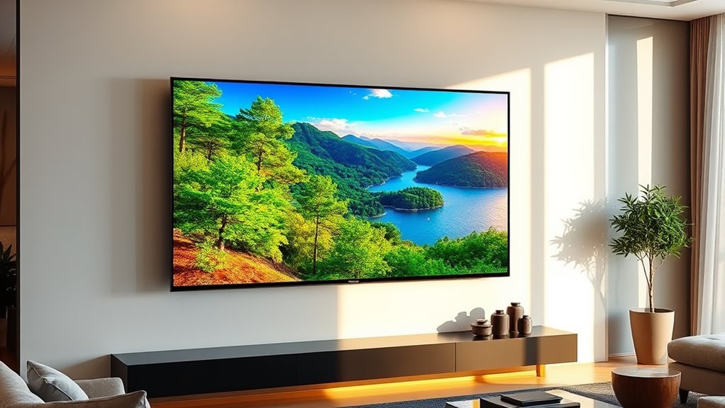 Choosing the right OLED TV size is essential to guarantee it fits your space and enhances your viewing experience. Measure your wall or furniture area to ensure the TV doesn’t crowd the room or get lost in the space. Think about your seating distance; for example, a 55-inch TV works best about 7 to 9 feet away. Larger screens, like 65 inches or more, offer a more cinematic feel, but they need enough room to avoid overwhelming the space or creating awkward viewing angles. Compatibility with your room’s layout and furniture setup is key—selecting a size that suits your environment ensures a comfortable, immersive experience. Proper sizing makes a big difference in both aesthetics and enjoyment.