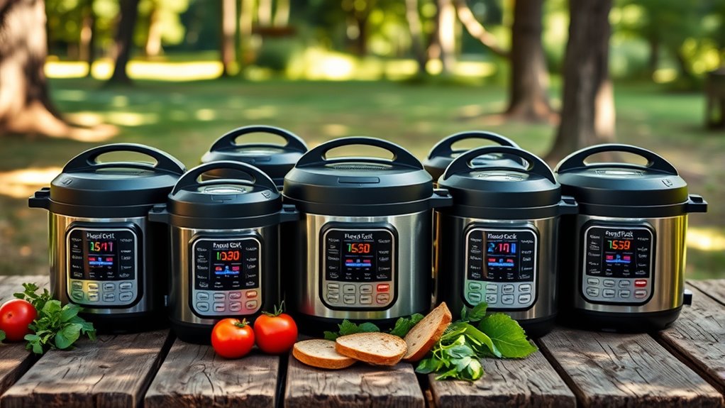 Choosing a portable multicooker for travel means prioritizing size and weight to guarantee easy packing and handling. I look for models under 8 inches in diameter and height so it fits comfortably in luggage, backpacks, or small storage spaces. Weighing less than 3 pounds makes it easier to carry without strain. Features like foldable handles or detachable parts help reduce bulk, making packing more convenient. I also consider durability; a sturdy exterior is essential to withstand frequent transport and prevent damage. A secure lid and non-slip feet are must-haves to avoid spills and accidents during travel. Overall, selecting a compact, lightweight device with thoughtful features ensures I can enjoy versatile cooking without sacrificing portability.