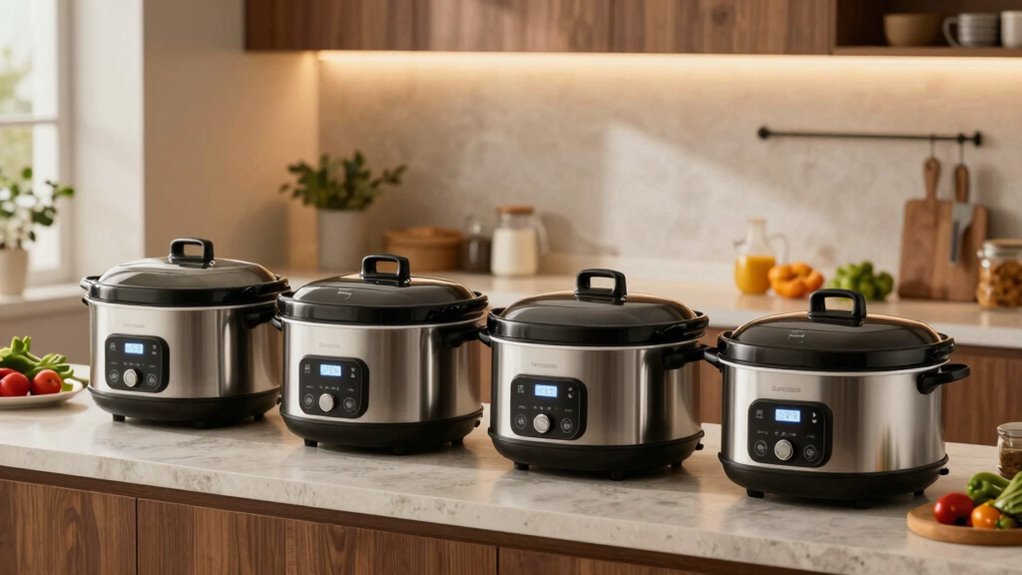 A slow cooker’s user interface plays a key role in how easily you can set and manage features like delayed start. A simple interface with clear buttons and labels makes programming your desired start time straightforward, minimizing confusion. Digital displays with intuitive controls allow for quick understanding and precise adjustments, reducing setup errors. Touch controls and minimalistic menus enhance usability, especially for those less familiar with advanced appliances. Consistent and straightforward operation helps you learn the system faster, so you spend less time figuring things out. Visual indicators, such as icons or LED lights, confirm your settings and show the current status of the delayed start function. Overall, a clean, user-friendly interface guarantees you can operate your slow cooker confidently and efficiently.