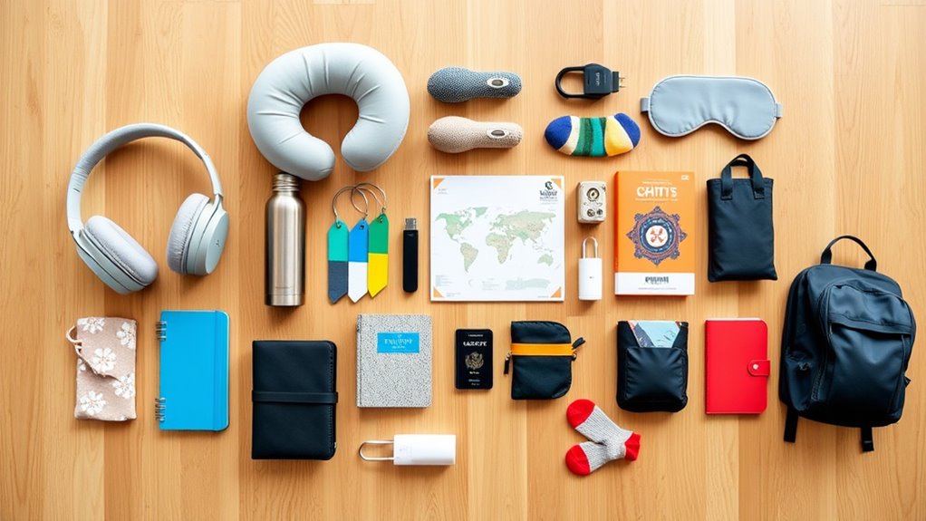 Did you know that 64% of travelers say comfort impacts their overall flight experience? Travel gifts like noise-canceling headphones or plush neck pillows can markedly boost in-flight comfort. I always pack a cozy blanket and a good eye mask, which help me relax and rest better. These thoughtful gifts turn long flights into more pleasant journeys, making the time fly by and arriving refreshed.