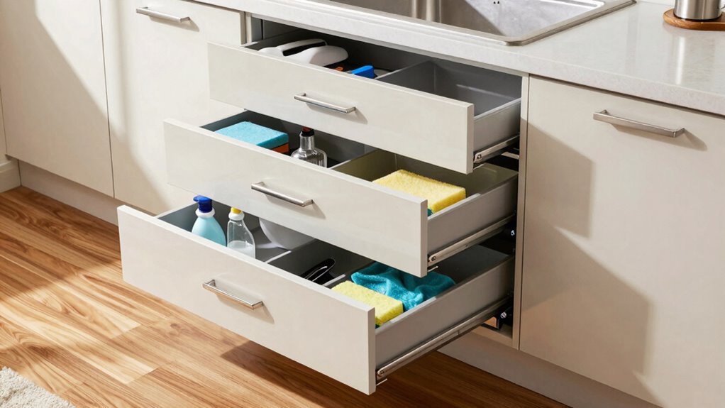 Finding an under-sink sliding drawer system that fits your budget doesn’t mean you have to sacrifice practicality. Affordable options typically cost less than $50, making them perfect for renters on a tight budget. Many of these systems feature simple installation methods like adhesive nano tape or no-tool setup, ensuring you won’t damage your rental surfaces. While they usually support around 20-35 lbs, they’re suitable for lightweight items like cleaning supplies or small bottles. Keep in mind, budget-friendly models often lack advanced features such as multiple tiers or extensive adjustability, but they still markedly improve organization. Plus, their easy removal and minimal surface impact make them ideal for temporary or non-permanent setups, giving you a practical solution without breaking the bank.